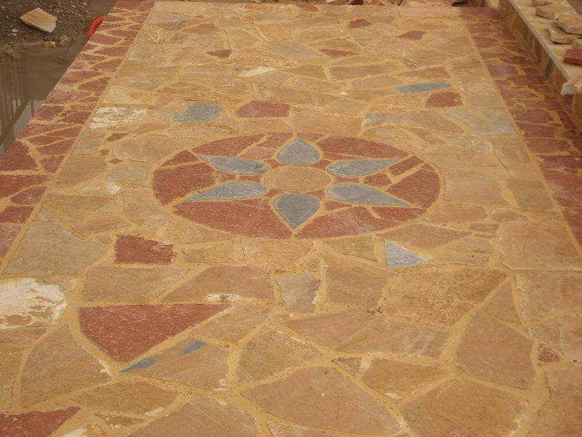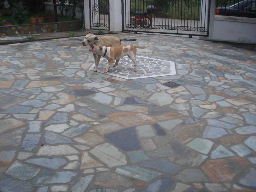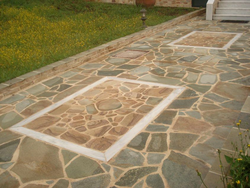 Επένδυση εξωτερικού δάπεδου με ακανόνιστη Καρύστου πράσσινη & με σχέδιο Καρύστου καφέ Επένδυση εξωτερικού δάπεδου με ακανόνιστη Καρύστου πράσσινη & με σχέδιο Καρύστου καφέ |